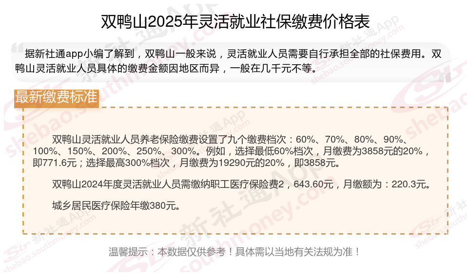据新社通app数据显示,双鸭山灵活就业养老保险缴费基数2024-2025年最新标准如下: