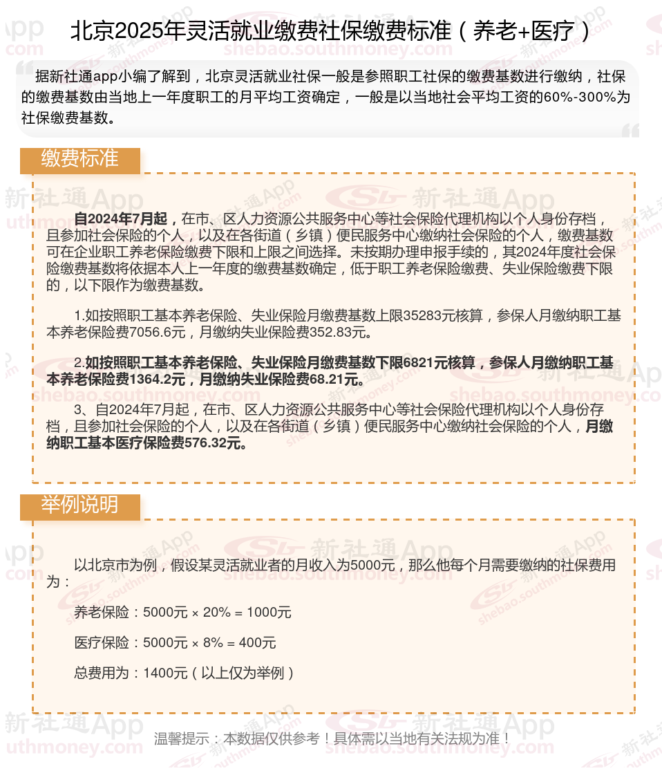 据新社通app数据显示,北京灵活就业养老保险缴费基数2024-2025年最新标准如下: