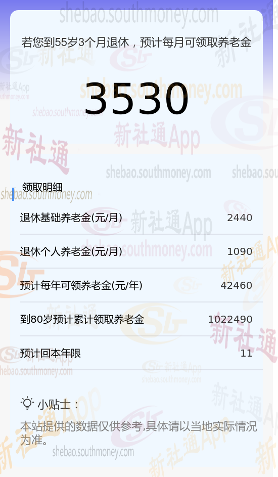沈某,东莞人,1970年出生,是一名拥有19载社保缴费年限的退休女性,缴费档次稳定在130%。岁月流转,她终于迎来了自己的退休时光。借助新社通app养老金计算器计算所得,沈某惊喜地发现,她每月可以领取到基础养老金大约2440元,再加上个人养老金约1090元,两项合计,她每月的养老金总额达到了3530元。虽然数额不大,但足以让她的退休生活充满温馨与安宁。