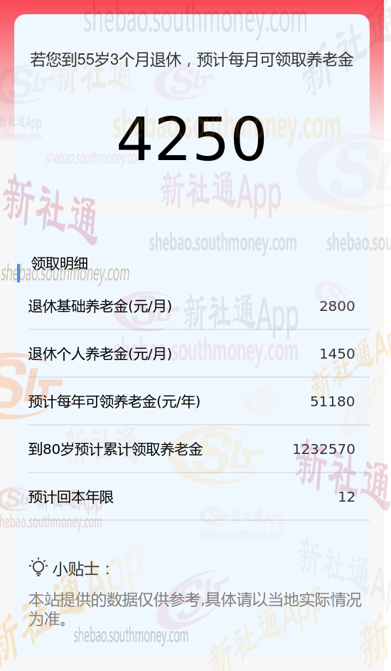 新社通app养老金计算器所得出,每月领取4250元养老金。