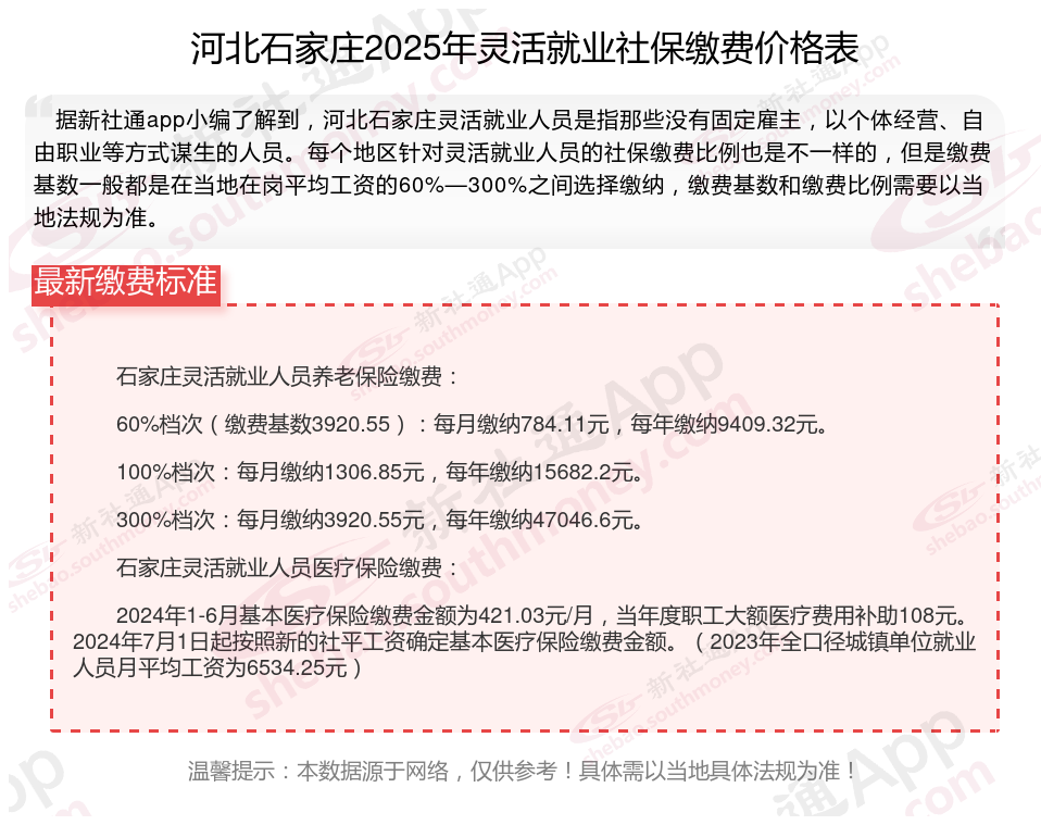 那么,灵活就业人员社保是多少钱一个月多少钱?根据新社通app-社保缴费查询工具提供的2025社保缴费标准详情数据: