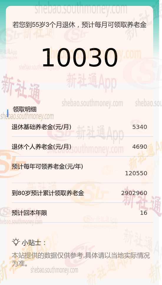 每月可领养老金总额:将基础养老金与个人养老金相加,每月可领取的养老金总额约为10030元(5340元+4690元)。