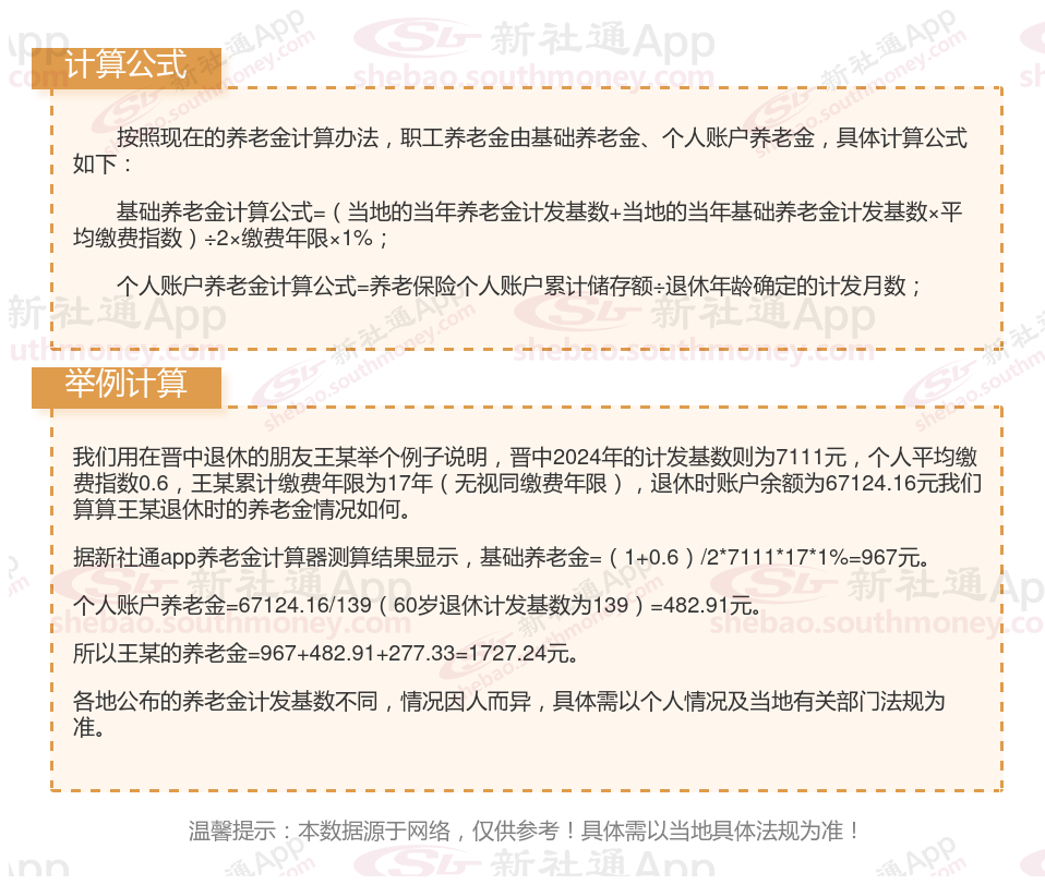 基础养老金=(退休时当地上一年度在岗职工月平均工资+本人平均工资指数)÷2×缴费年限×1%。