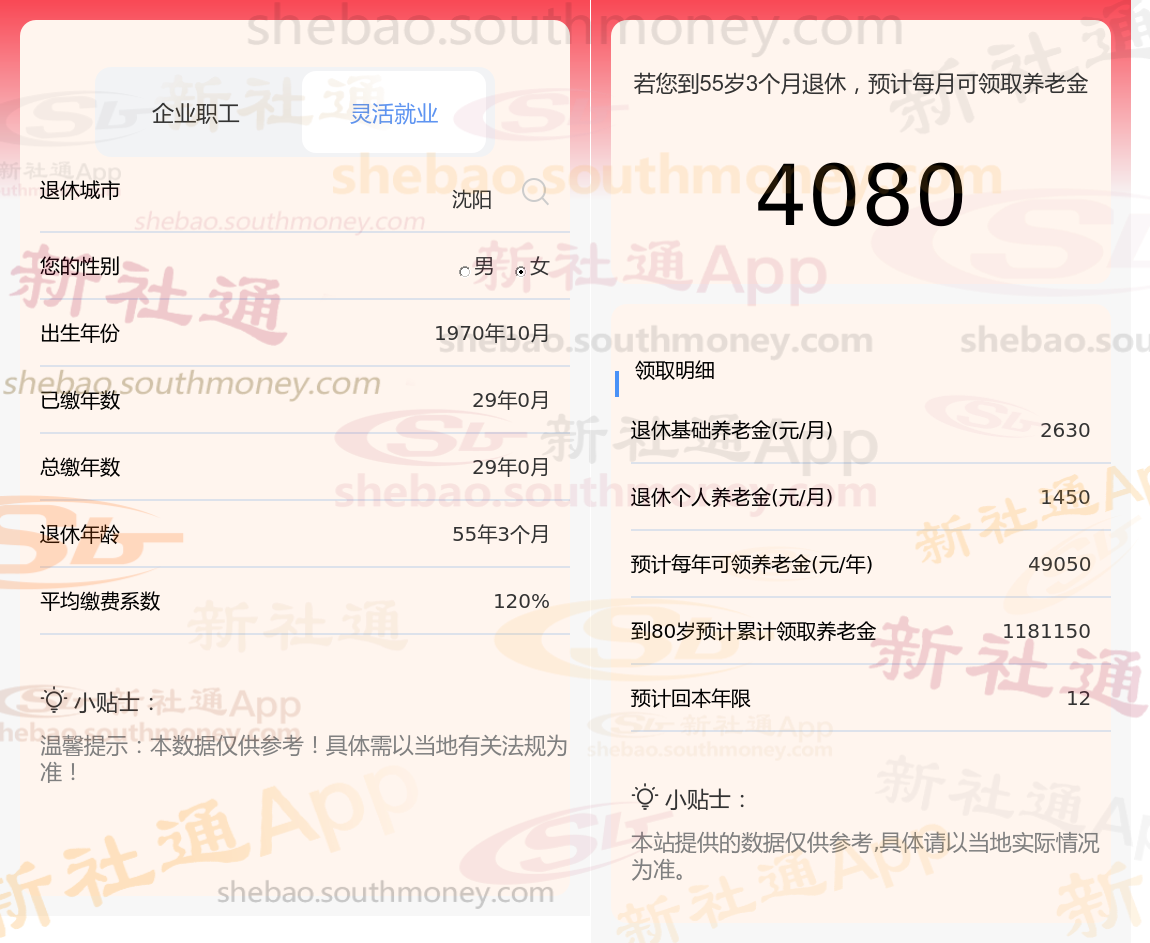 邻居吕某退休城市在沈阳,性别:女,出生年份:1970,总缴年数29年,缴费档次:120%,新社通app养老金计算器所得: