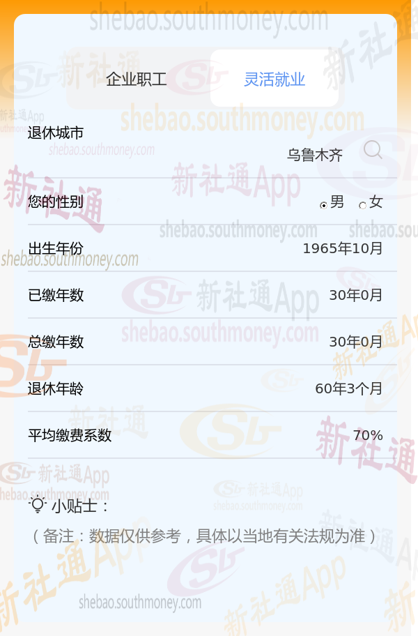 退休城市:新疆乌鲁木齐,性别:男,出生年份:1965,总缴年数30年,缴费档次:70%