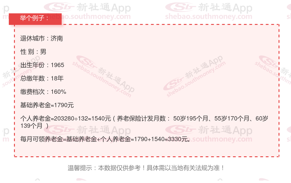 吕某,济南人,1965年出生,是一名拥有18载社保缴费年限的退休男性,缴费档次稳定在160%。岁月流转,他终于迎来了自己的退休时光。借助新社通app养老金在线计算器计算所得: