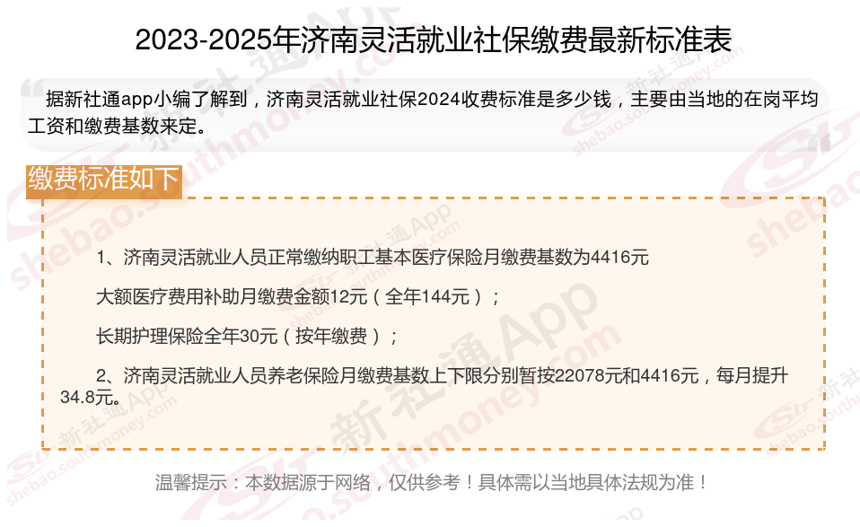 据新社通app数据显示,2024-2025年济南灵活就业人员养老保险的缴费标准: