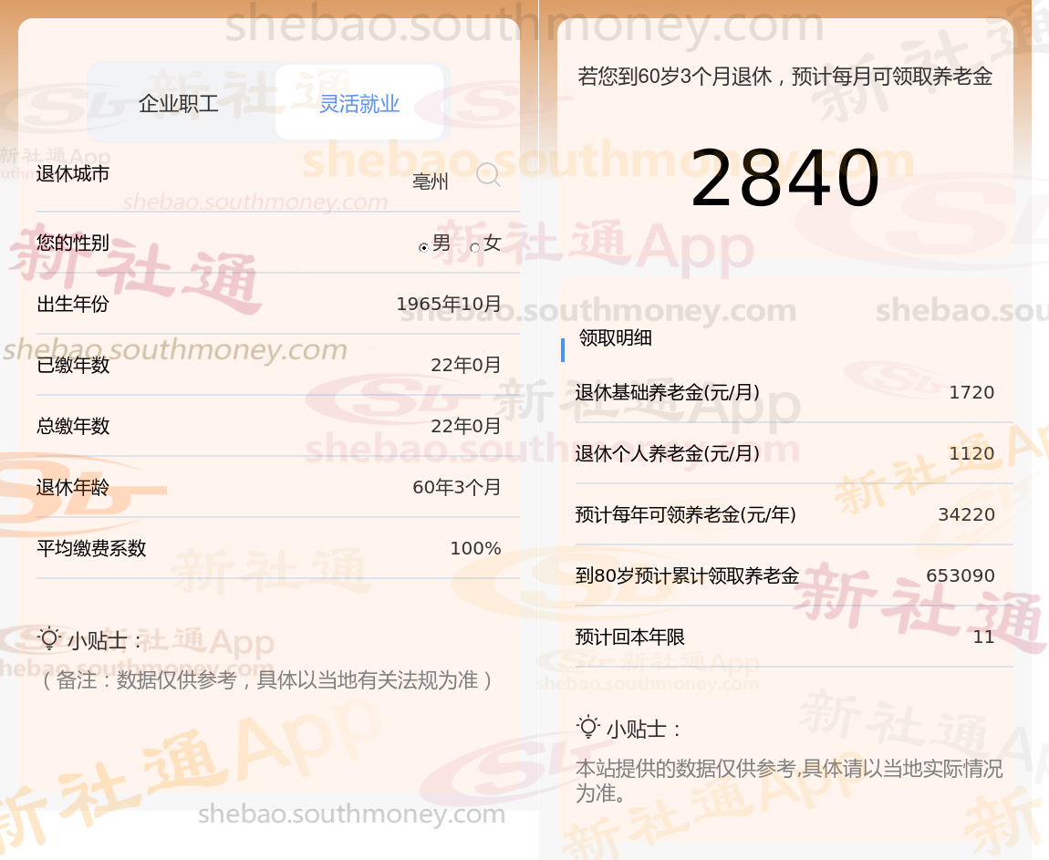 退休城市:亳州,性别:男,出生年份:1965,总缴年数22年,缴费档次:100%,新社通app养老金计算器所得: