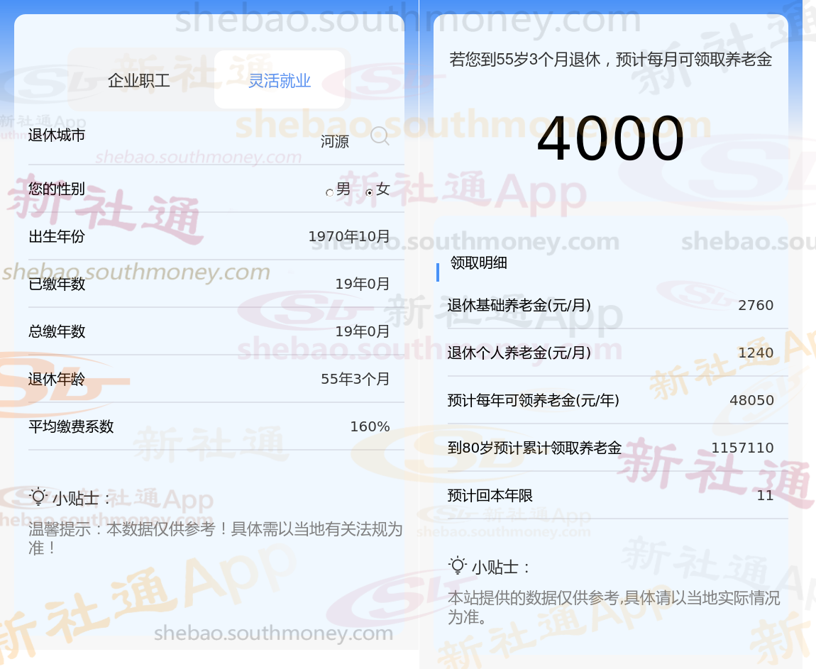 退休城市:河源,性别:女,出生年份:1970,总缴年数19年,缴费档次:160%,新社通app养老金计算器所得: