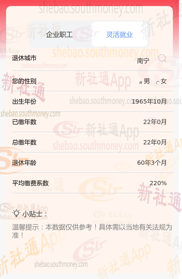 康某一位1965年出生的男性,目前定居在风景秀丽的南宁并享受着退休生活。他的社会保险缴纳年限是22年,且一直以较高的220%档次进行缴费,展现了他对未来生活的充分规划与准备。