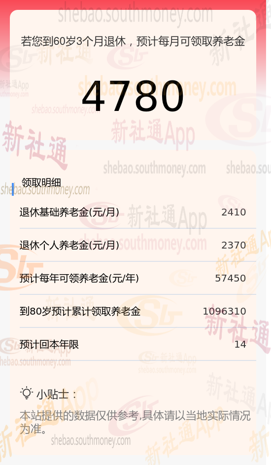 每月可领养老金总额:将基础养老金与个人养老金相加,每月可领取的养老金总额约为4780元(2410元+2370元)。