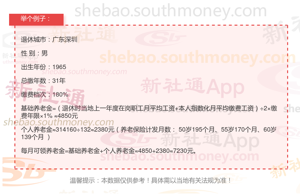 退休城市:广东深圳,性别:男,出生年份:1965,总缴年数31年,缴费档次:180%,新社通app养老金计算器所得: