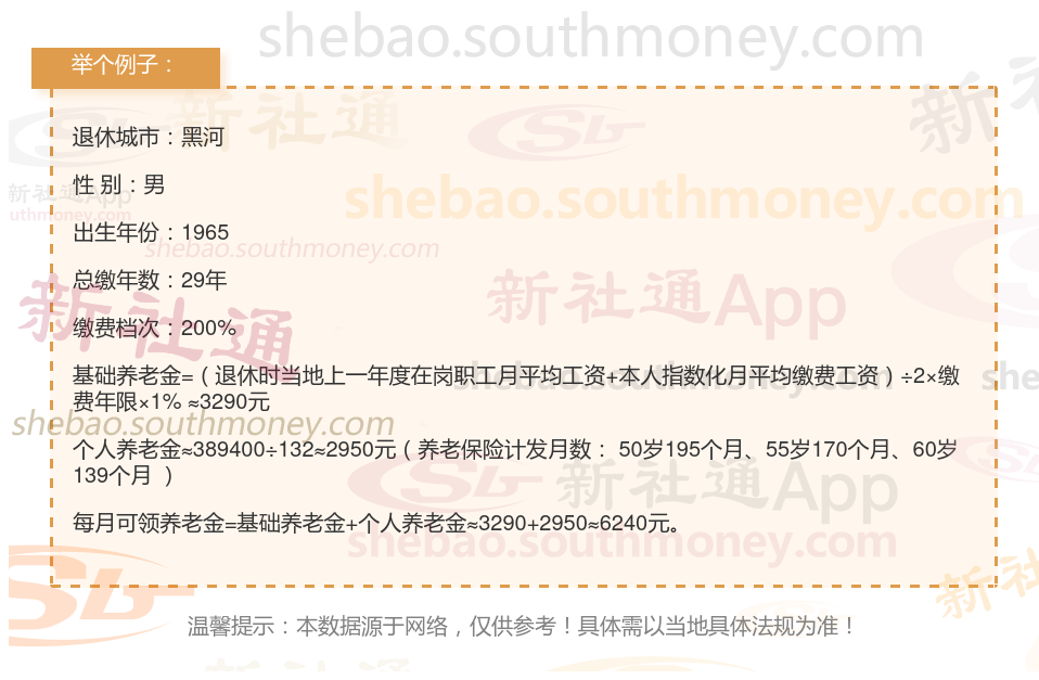 杨某,男,1965年出生,现居黑河并已退休。其养老保险缴纳情况如下:总缴费年限为29年,缴费档次达到200%。根据新社通app养老金计算器的估算结果: