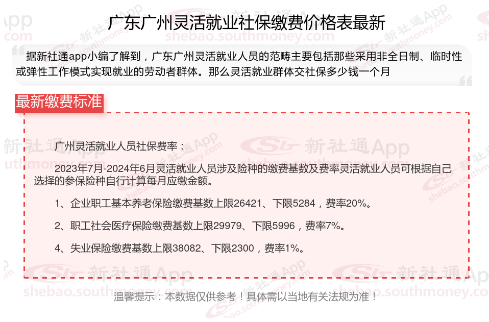 据新社通app数据显示,广东广州灵活就业养老保险缴费基数2024-2025年最新标准如下: