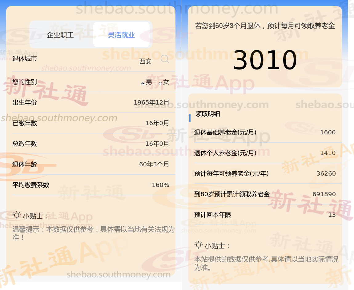 退休城市:西安,性别:男,出生年份:1965,总缴年数16年,缴费档次:160%,新社通app养老金计算器所得:
