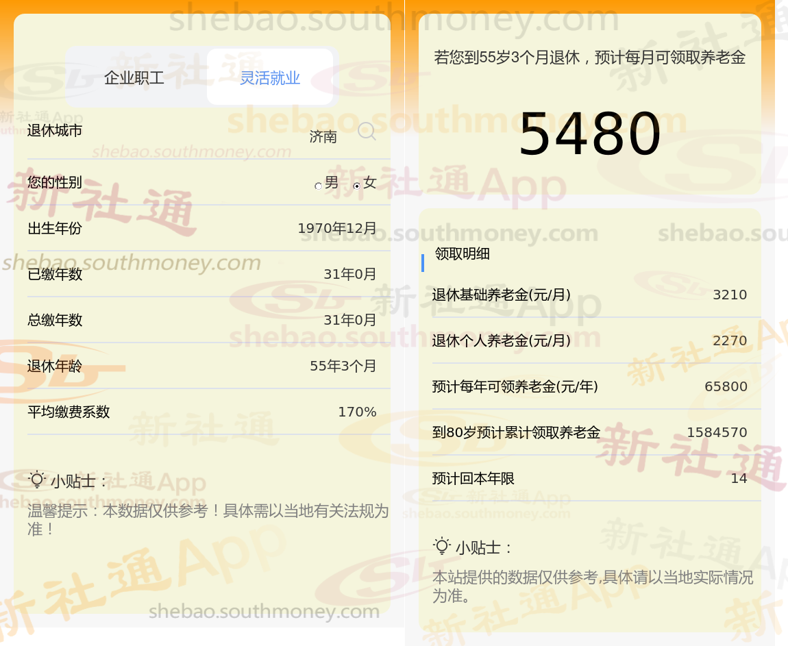 退休城市:山东济南,性别:女,出生年份:1970,总缴年数31年,缴费档次:170%,新社通app养老金计算器所得:
