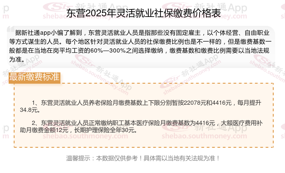 据新社通app数据显示,东营灵活就业养老保险缴费基数2024-2025年最新标准如下: