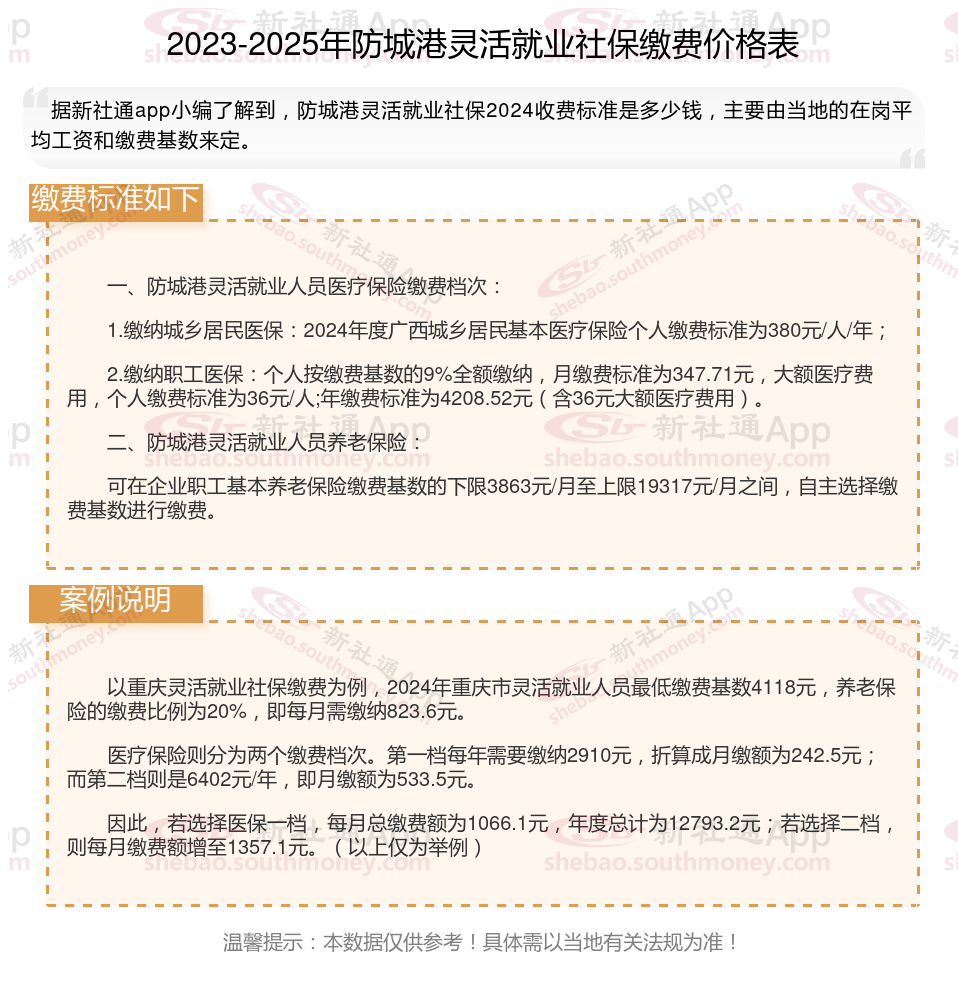 据新社通app数据显示,防城港灵活就业人员养老缴费基数2024-2025年最新标准如下: