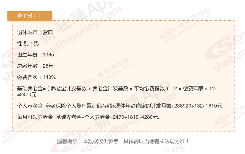 邻居刘某退休城市在营口,性别:男,出生年份:1965,总缴年数25年,缴费档次:140%