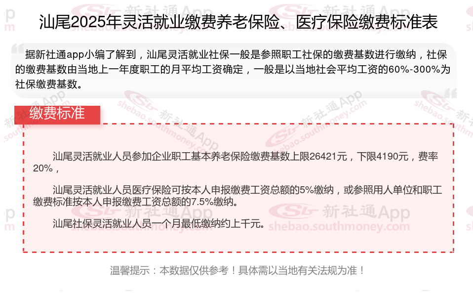 据新社通app数据显示,汕尾灵活就业养老保险缴费基数2024-2025年最新标准如下: