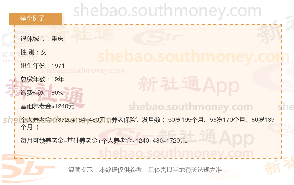 退休城市:重庆,性别:女,出生年份:1971,总缴年数19年,缴费档次:60%,新社通app养老金计算器所得: