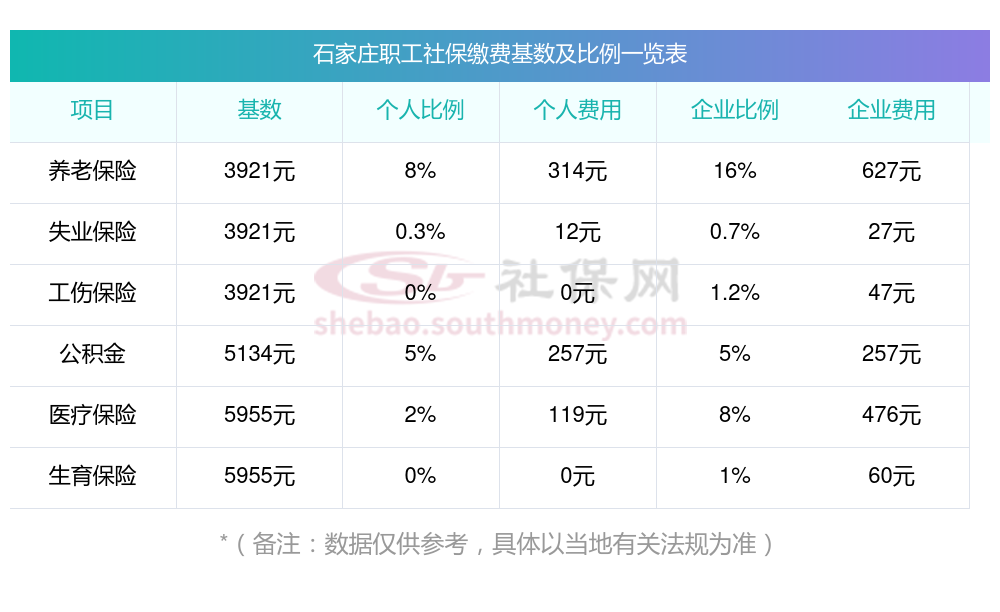 2025年石家庄社保缴费价格标准是多少,2025年石家庄社保缴费多少钱?下表是2025年石家庄社保费用明细参考,新社通app-社保缴费查询工具提供的最新数据如下: