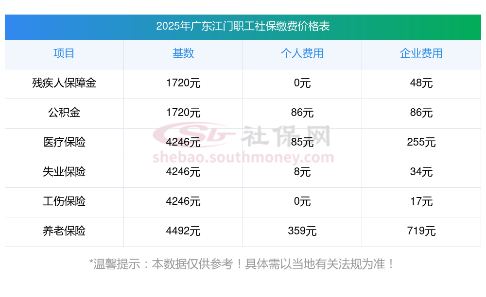 2025年广东江门社保缴费多少钱?下表是2024-2025年广东江门社保费用明细参考,新社通app-社保缴费查询工具提供的最新数据如下:
