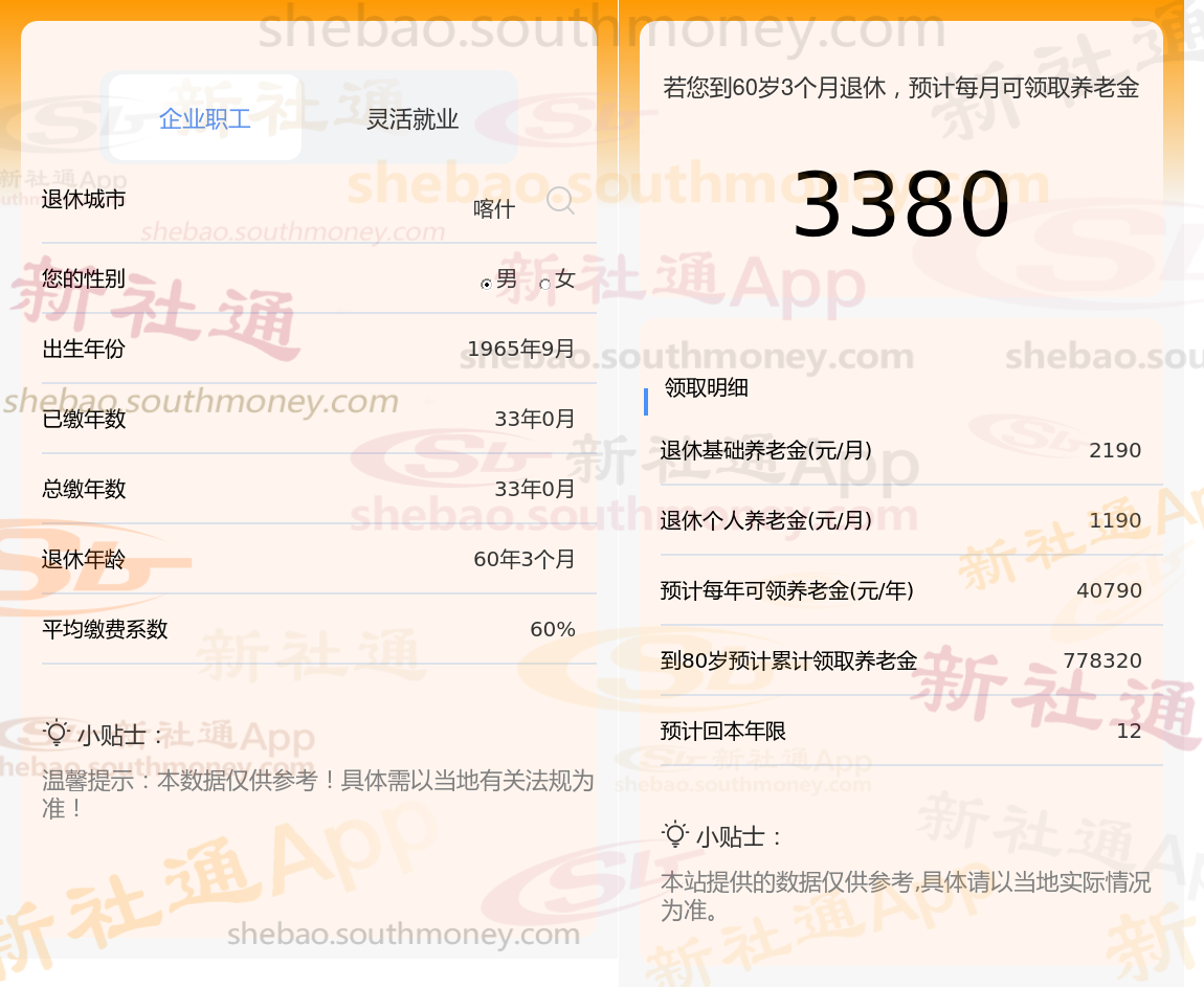社保按60%档次缴费的吕某,新疆喀什城市退休,出生于1965年,工龄33年,男性。岁月流转,他终于迎来了自己的退休年龄。根据新社通app养老金在线计算器计算所得: