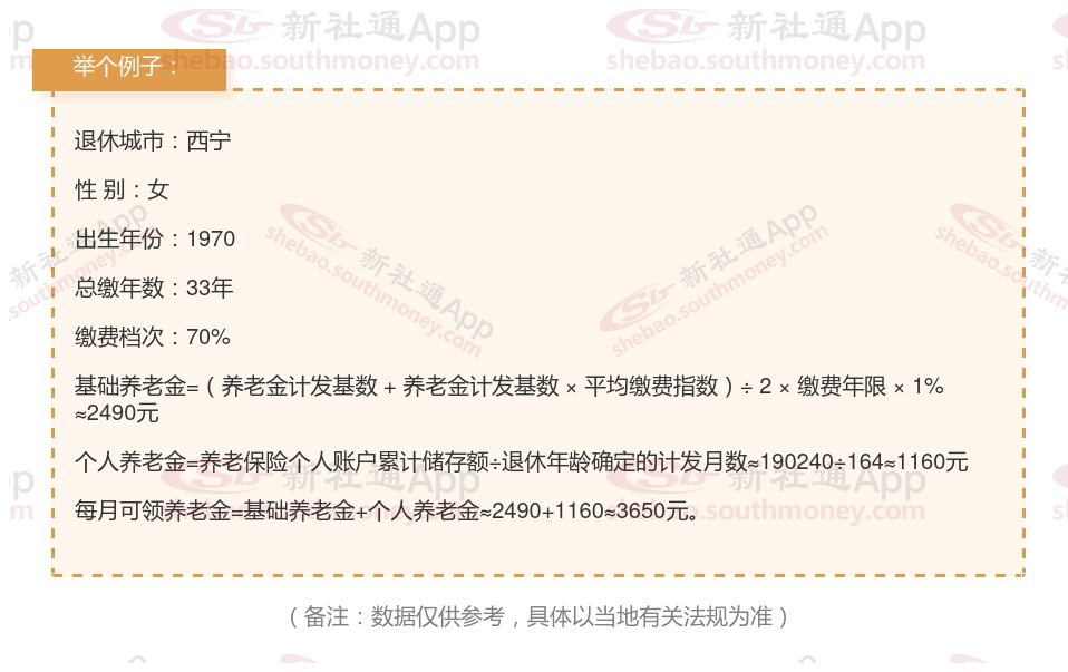 退休城市:西宁,性别:女,出生年份:1970,总缴年数33年,缴费档次:70%,新社通app养老金计算器所得: