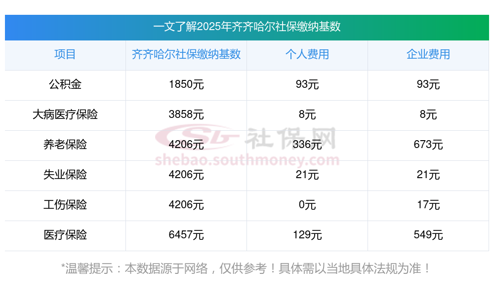 2025年齐齐哈尔社保缴费价格标准是多少,2025年齐齐哈尔社保缴费多少钱?下表是2025年齐齐哈尔社保费用明细参考,新社通app-社保缴费查询工具提供的最新数据如下: