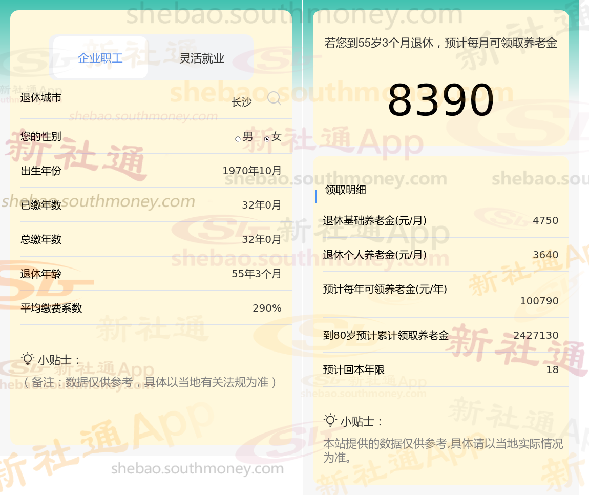 一名湖南长沙女性退休人员的概况:她出生于1970年,作为职工已缴纳社保满32年,且缴费档次达到290%。