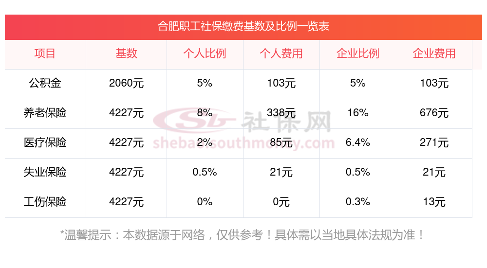 2025年合肥社保缴费价格标准是多少,2025年合肥社保缴费多少钱?下表是2025年合肥社保费用明细参考,新社通app-社保缴费查询工具提供的最新数据如下: