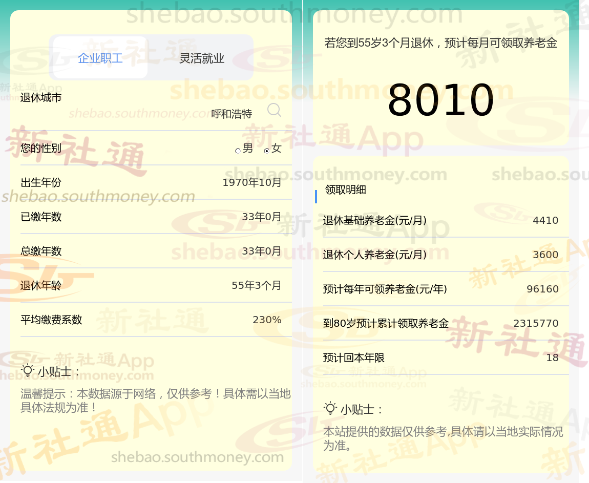 一名呼和浩特女性退休人员的概况:她出生于1970年,作为职工已缴纳社保满33年,且缴费档次达到230%。