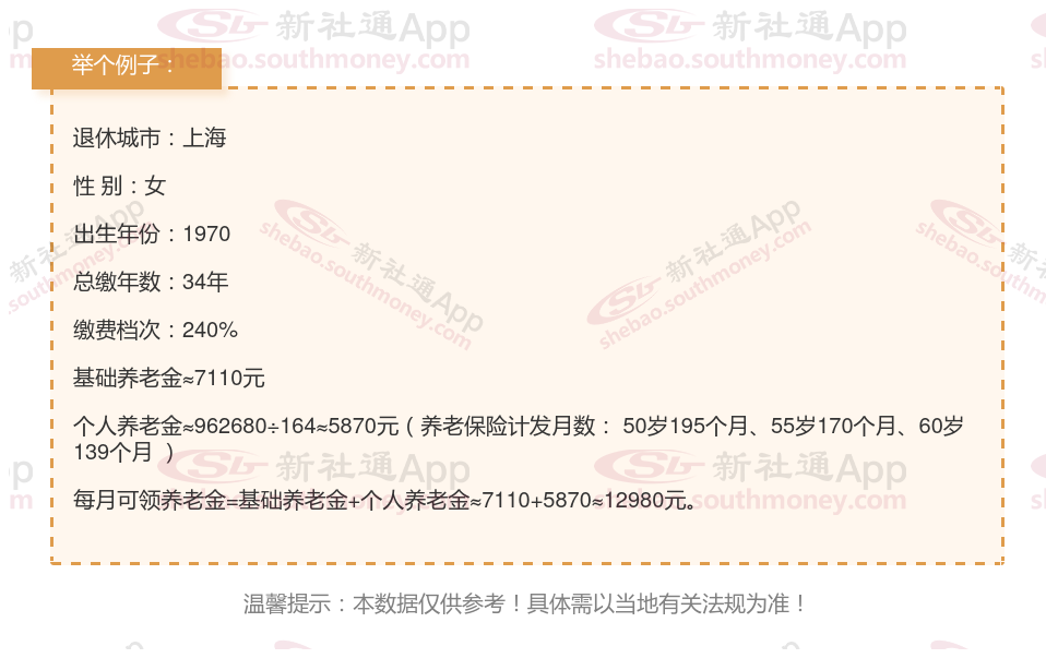 刘某,上海人,1970年出生,是一名拥有34载社保缴费年限的退休女性,缴费档次稳定在240%。岁月流转,她终于迎来了自己的退休时光。借助新社通app养老金在线计算器计算所得: