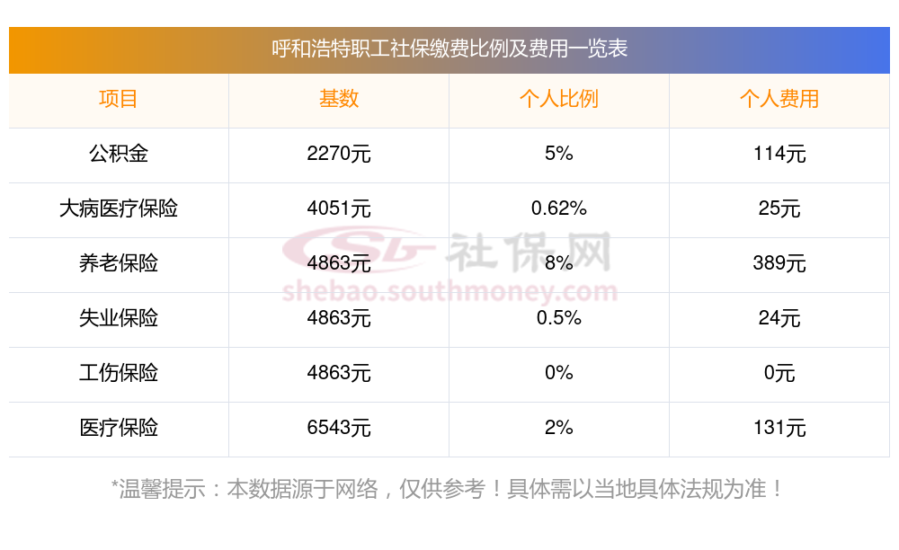 呼和浩特缴费社保比例一览 社保公司和个人各交多少?下表是2024-2025年呼和浩特社保费用明细参考,新社通app-社保缴费查询工具提供的最新数据如下: