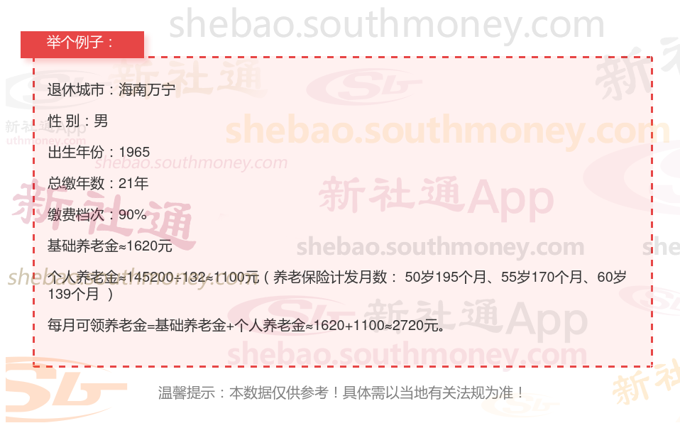 夏某,海南万宁人,1965年出生,是一名拥有21载社保缴费年限的退休男性,缴费档次稳定在90%。岁月流转,他终于迎来了自己的退休时光。借助新社通app养老金在线计算器计算所得: