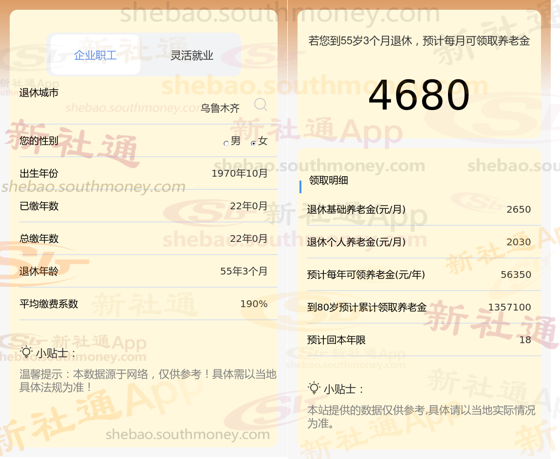 个人详情:女性,1970年出生,新疆乌鲁木齐地区退休,累计缴费22年,缴费比例为190%。