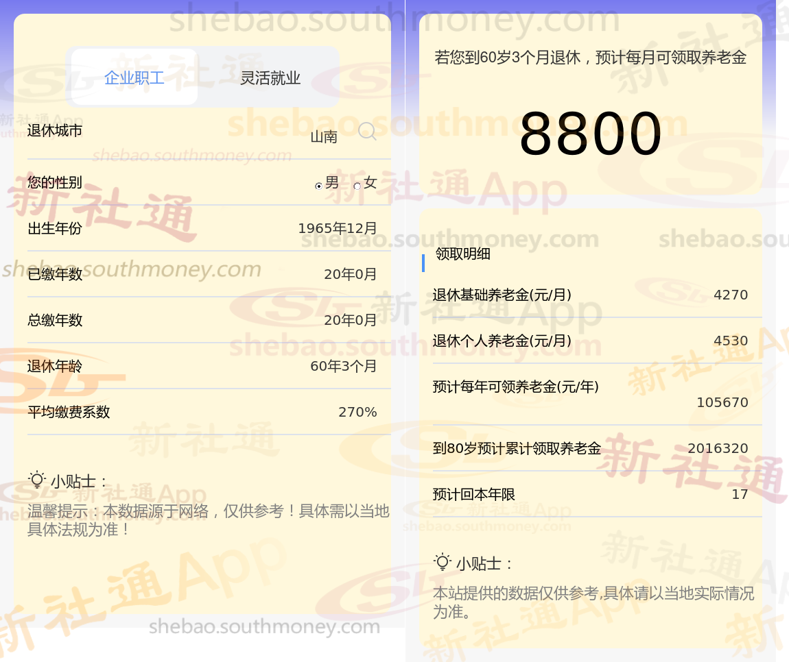 孔某,山南人,1965年出生,是一名拥有20载社保缴费年限的退休男性,缴费档次稳定在270%。岁月流转,他终于迎来了自己的退休时光。借助新社通app养老金在线计算器计算所得: