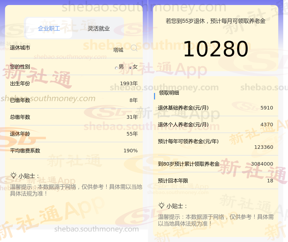 通过新社通APP-养老金计算所得:退休城市、出生年份、退休年龄、缴费系数都相同的情况下,社保缴费年限累计31年时,计算如下: