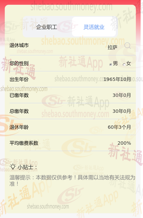 和社保网-APP一起看个例子,拉萨工龄30年养老退休金如何计算?