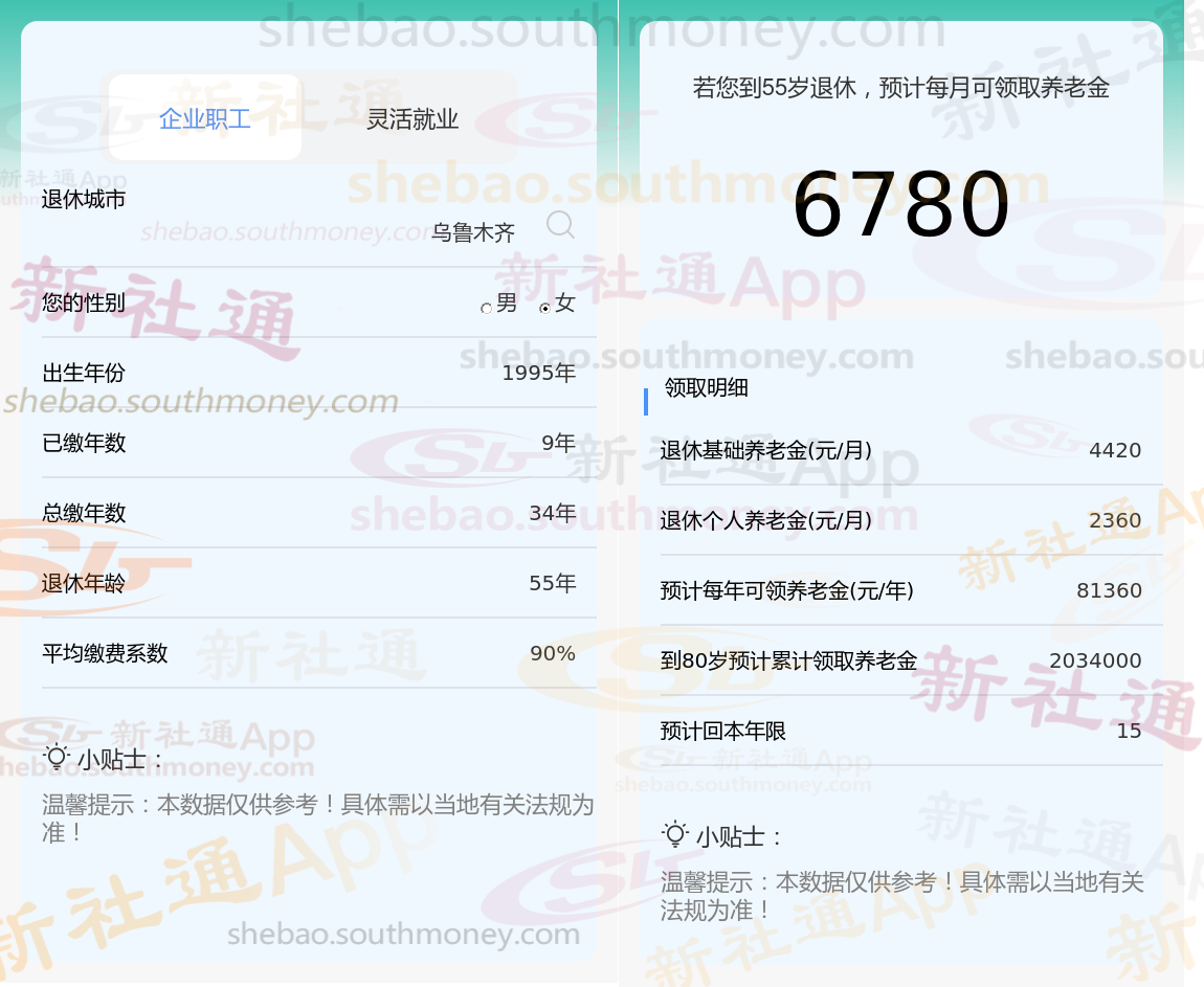 通过新社通APP-养老金计算所得:退休城市、出生年份、退休年龄、缴费系数都相同的情况下,社保缴费年限累计34年时,计算如下: