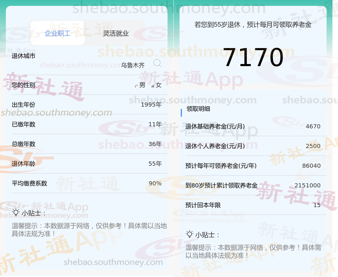 通过新社通APP-养老金计算所得:退休城市、出生年份、退休年龄、缴费系数都相同的情况下,社保缴费年限累计36年时,计算如下: