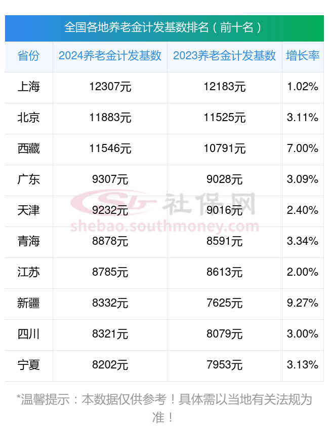 据新社通app显示,上海位列第一位,养老金计发基数达到12307.00元,增长率为1.02%;