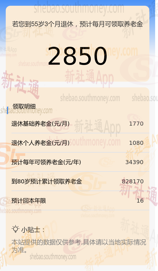 新社通app养老金计算器所得出,每月领取2850元养老金。