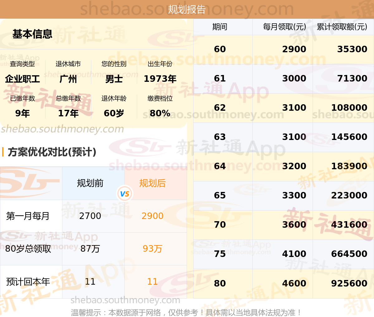 参保城市:广州,性别:男士,出生年月:1973,已缴年限:9年,总缴年数:17年,退休年龄:60岁,缴费档位:80%。