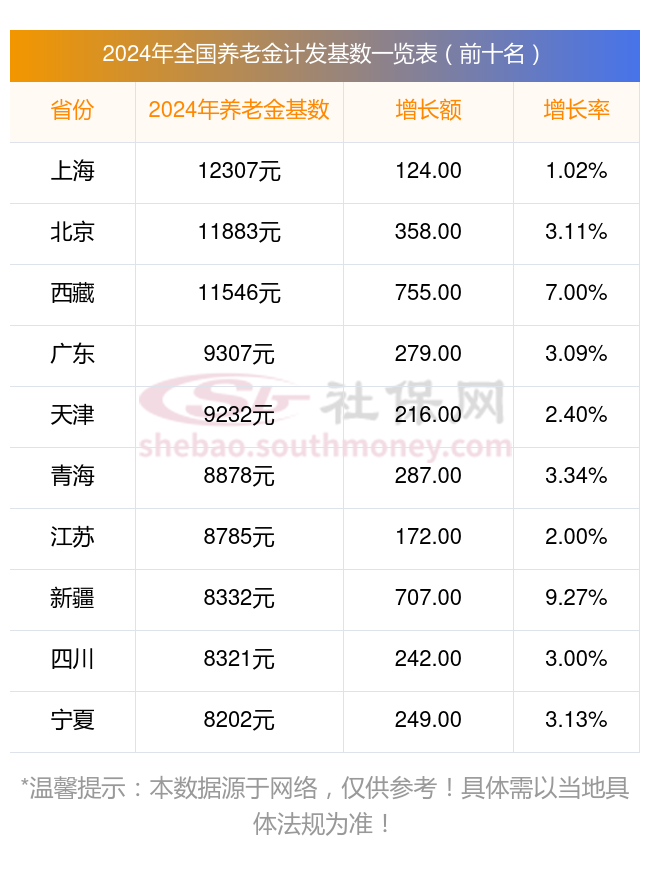 据新社通app显示,2024年上海位列第一位,养老金计发基数达到12307.00元;北京排名第二,养老金计发基数为11883.00元;西藏排名第三,养老金计发基数11546.00元。排名前10的还有:广东、天津、青海、江苏、湖北、新疆、四川。