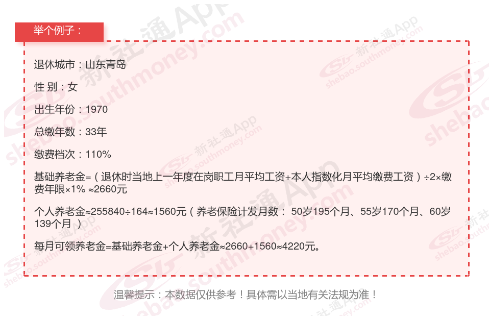 退休城市:山东青岛,性别:女,出生年份:1970,总缴年数33年,缴费档次:110%
