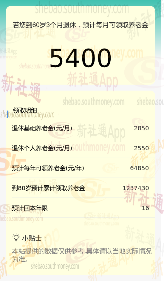 总养老金月度领取额:将基础养老金和个人养老金相加,得出每月可领取的养老金总额大约为5400元(即2850元基础养老金+2550元个人养老金)。