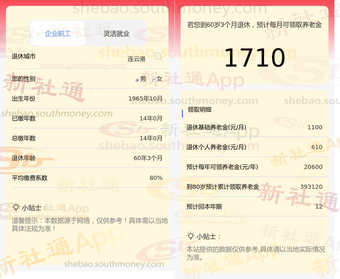 笔友沈某退休城市在连云港,性别:男,出生年份:1965,总缴年数14年,缴费档次:80%,新社通app养老金计算器所得: