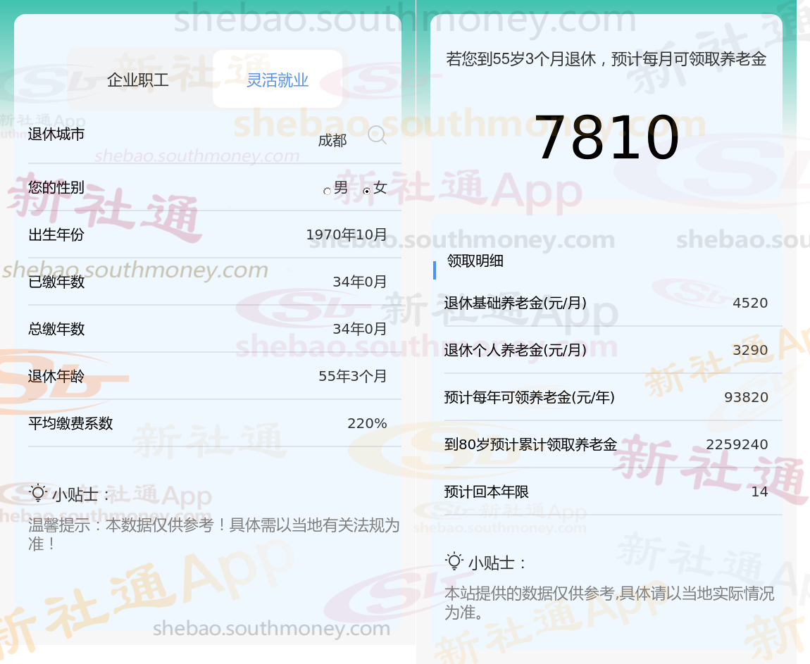 王某是一位女性,1970年出生,现已退休。她居住的城市是成都,在职业生涯中,她累计缴纳了34年的社会保险,缴费档次为220%。